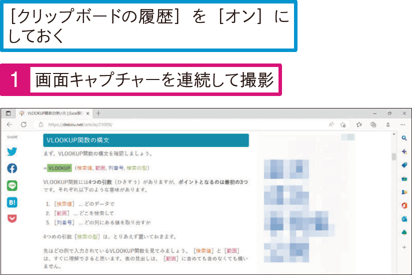 この機能を利用するためには、まず[設定]の[システム][クリップボード]で[クリップボードの履歴]をオンにする必要があります。[クリップボードの履歴]をオンにすると、Snipping Toolでスクリーンショットを撮った後、[Windows]+[V]キーを押してクリップボードの履歴から必要なスクリーンショットを選択して保存できます。こうすることで、スクリーン ショット 複数を保存して比較することが容易になります。