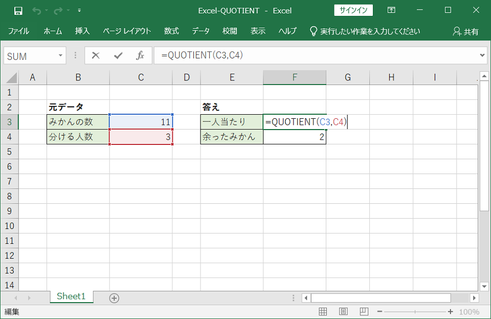 エクセルのQUOTIENT関数で整数商を簡単に求める方法